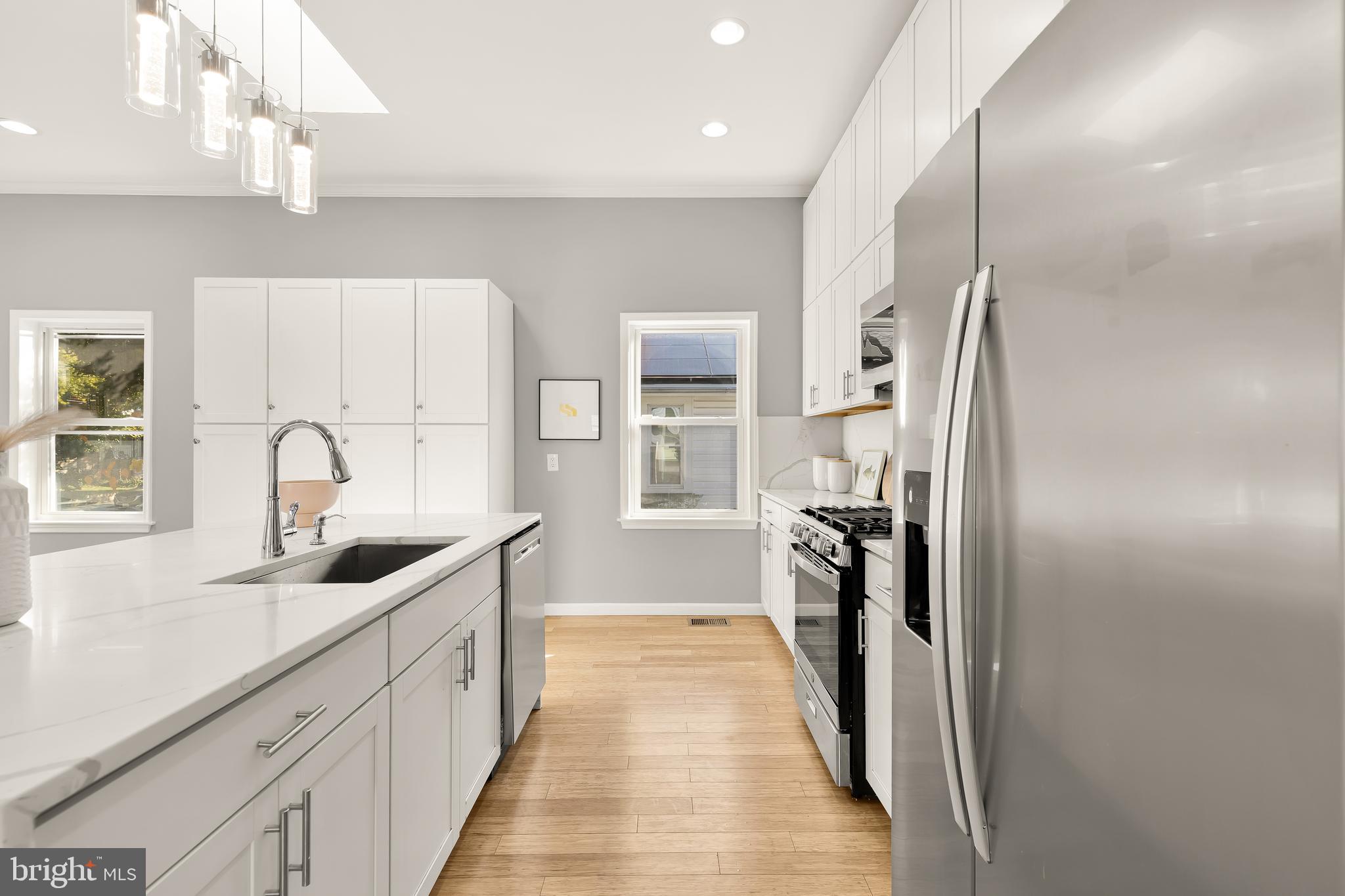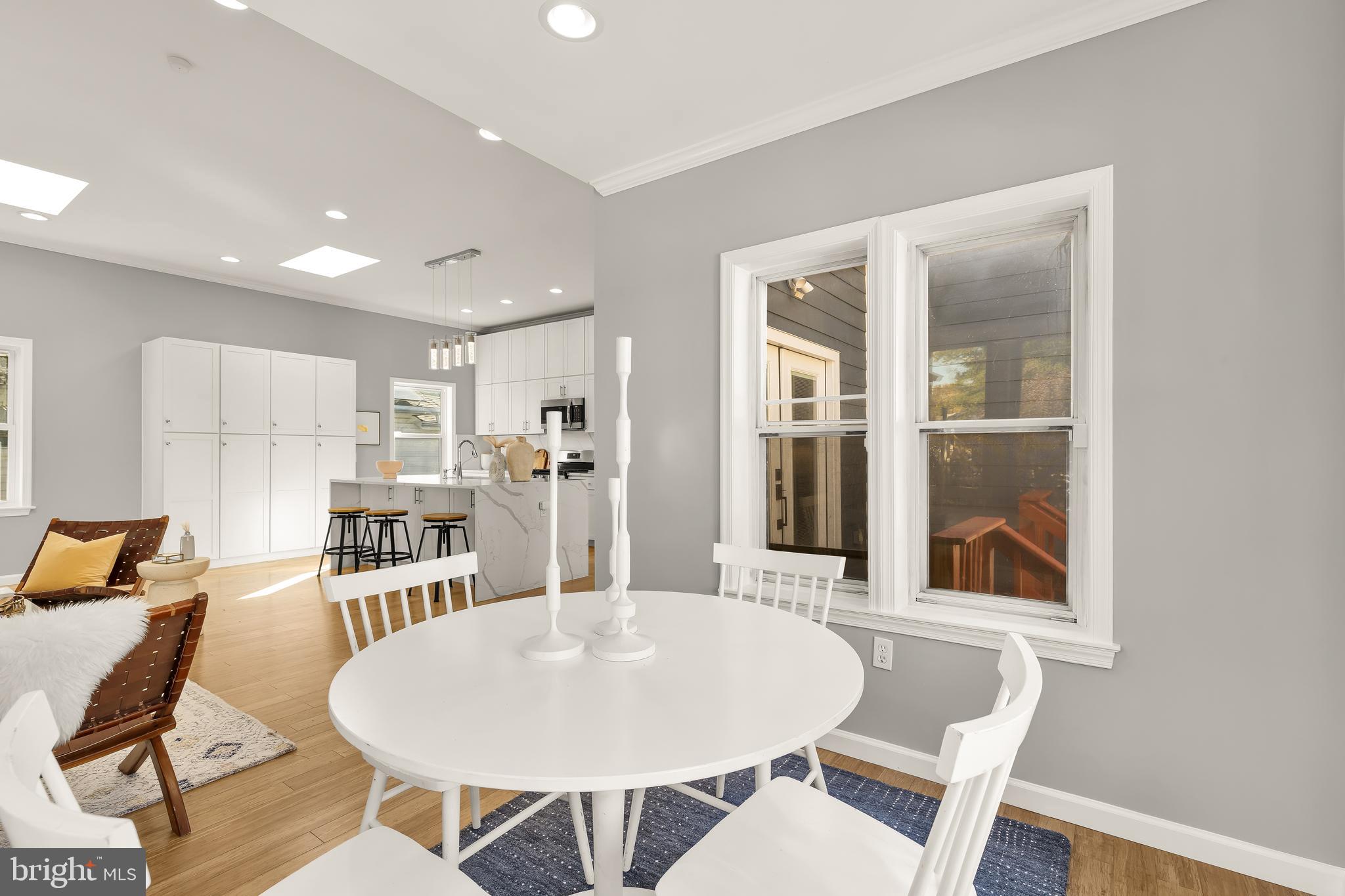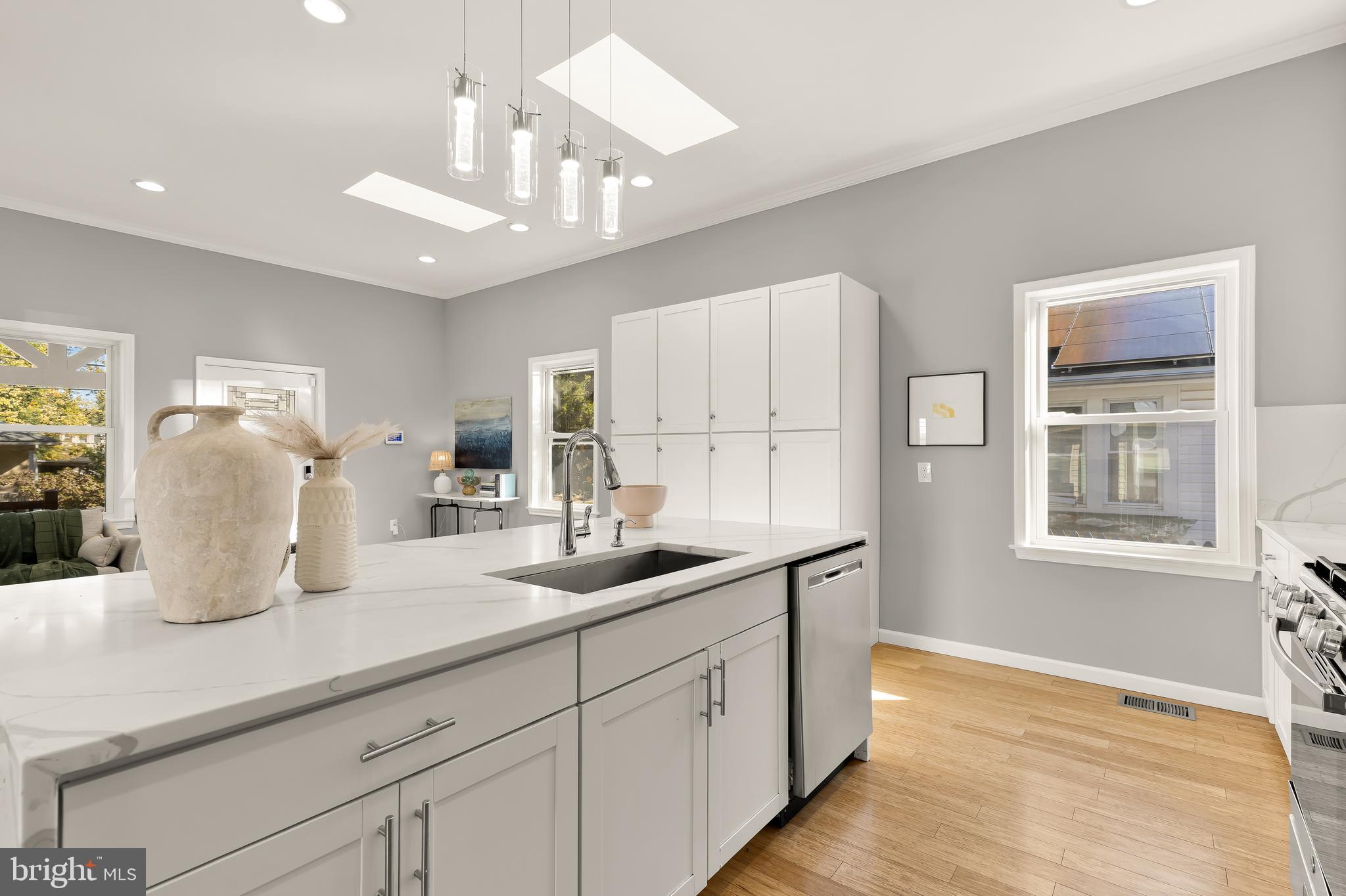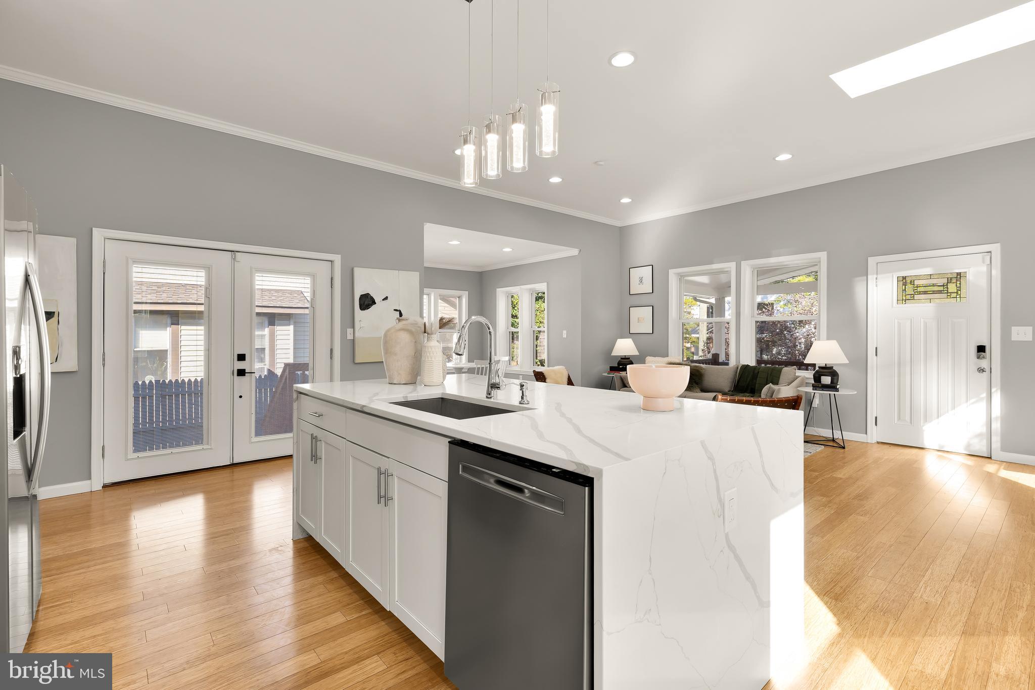 Step inside and feel the wow factor -- the open-concept main level impresses with 13-foot ceilings, natural light pouring in from multiple skylights, and seamless flow between the living, dining, and kitchen spaces. Every detail has been curated for both style and functionality, from the unique designer light fixtures to the wide-plank flooring that carries throughout.